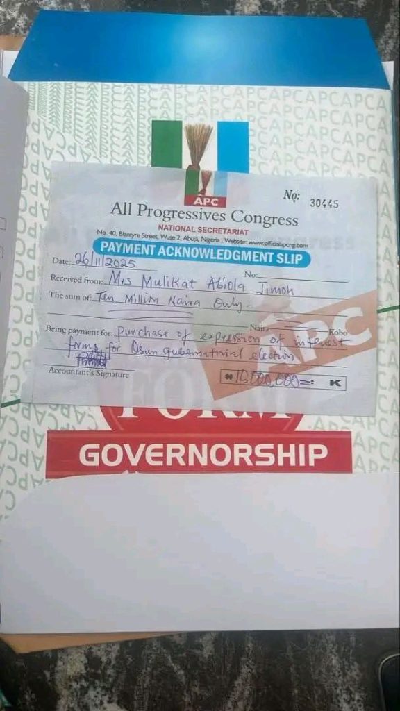 A former member of the Osun State House of Assembly, Dr. Mulikat Abiola Jimoh, has joined the 2026 governorship race under the All Progressives Congress (APC).