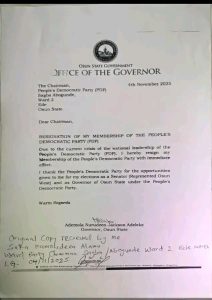 A letter of resignation by Adeleke obtained by newsmen, was addressed to the PDP chairman of his Ward 2, Sagba Abogunde, Ede, Osun State, which was dated 4th November 2025.