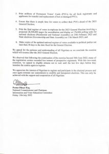 “Ensure that there is ample time for voters to collect their PVCs ahead of the 2023 General Election; print the final register of voters in triplicate for the 2023 General Election involving a projected 28,500,000 pages for accreditation and display at 176,846 polling units for national elections (Presidential and National Assembly) on 25th February, 2023 and state elections (Governorship and State Assembly) on 11th March, 2023.