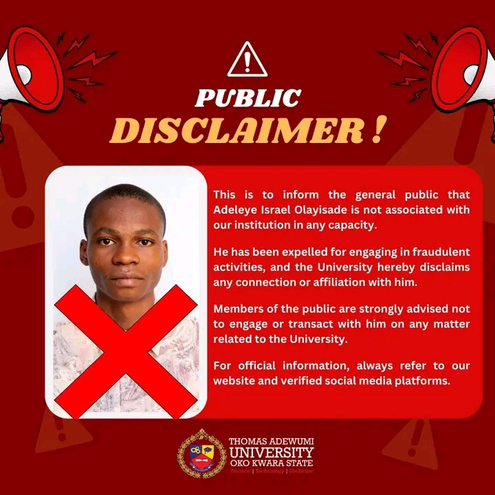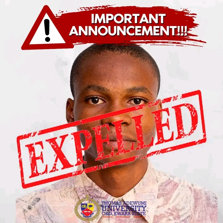 Thomas Adewumi University, Oko, Kwara State, has expelled a former student, Mr. Adeleye Israel Olayisade, over his alleged involvement in fraudulent activities.