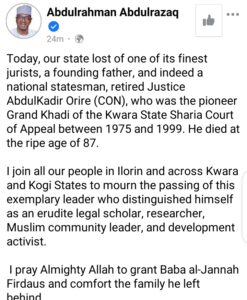 He wrote:”Today, our state lost of one of its finest jurists, a founding father, and indeed a national statesman, retired Justice AbdulKadir Orire (CON), who was the pioneer Grand Khadi of the Kwara State Sharia Court of Appeal between 1975 and 1999. He died at the ripe age of 87.