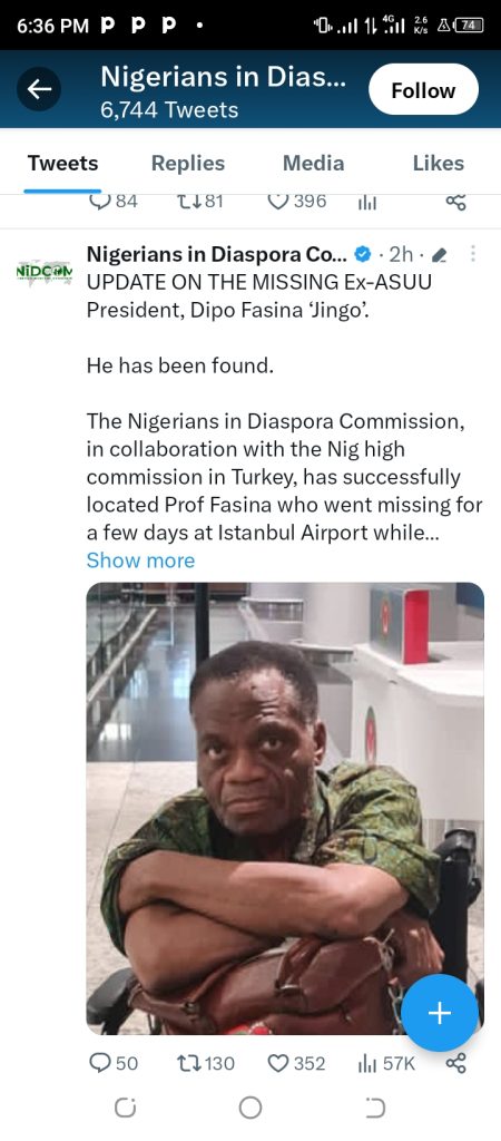 “The Nigerians in Diaspora Commission, in collaboration with the Nigerian High Commission in Turkey, has successfully located Prof Fasina, who went missing for a few days at Istanbul Airport while connecting on a flight back home.”