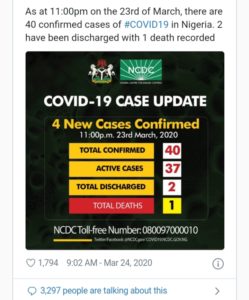 The announcement states that Nigeria’s COVID-19 infections now peak at 40.