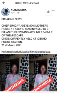 This was revealed to AMILOADED in a video posted by Igboho’s spokesman, Olayomi Koiki on his official Facebook page with a caption which stated: “Chief Sunday Adeyemo’s Mothers House At Igboho was invaded by 3 Fulani this evening around 7: 45pm. 2 of them escape. One is currently held at Igboho police station.”