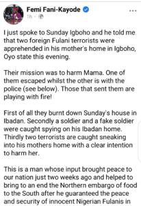 “First of all they burnt down Sunday’s house in Ibadan. Secondly a soldier and a fake soldier were caught spying on his Ibadan home. Thirdly two terrorists are caught sneaking into his mothers home with a clear intention to harm her.