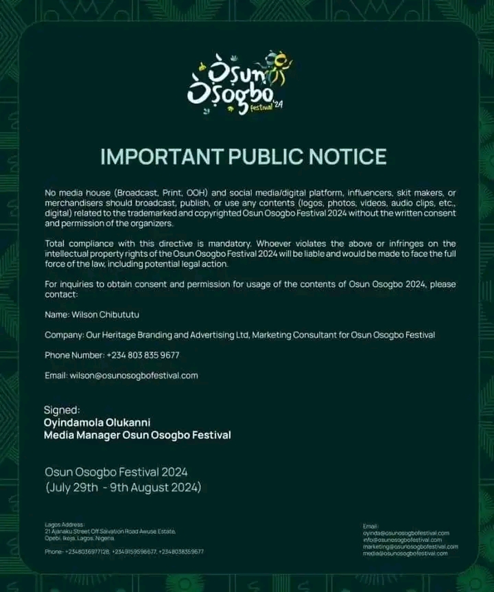 In a public notice that has gone viral, which was obtained by AMILOADED correspondent on Saturday, the organizers stated that no content related to the festival – including logos, photos, videos, audio clips, and digital materials – should be broadcast without written consent and permission.
