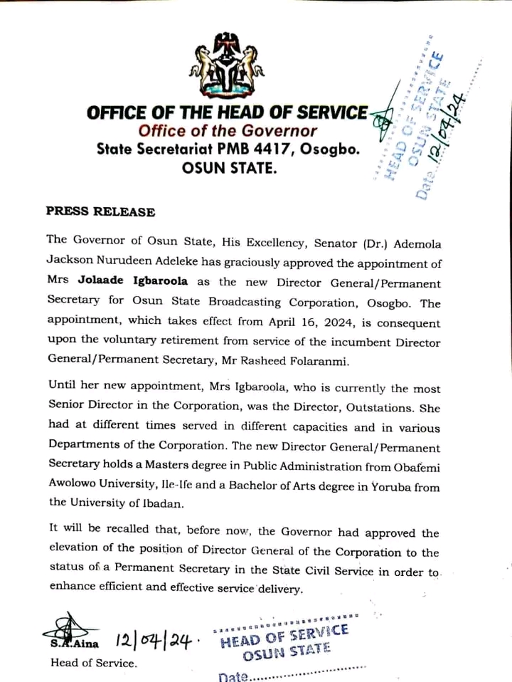 The Osun State Governor, Senator Ademola Adeleke has approved the appointment of Mrs Jolaade Igbaroola as the new Director General/Permanent Secretary for Osun State Broadcasting Corporation (OSBC), Osogbo.