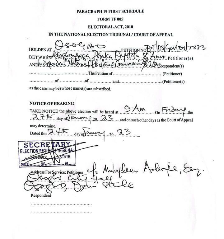 This was contained in a court paper signed by the Election petition Tribunal secretary, Address to the petitioner, dated 24th, January, 2023, and obtained by AMILOADED Correspondent on Tuesday.
