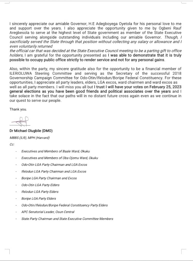 He said, “It’s with mixed feeling that I write to inform you that after many days and weeks of consultation with different stakeholders, last Sunday, I was at my ward meeting one more time to say thank you to party members for their support over the years before tendering my membership resignation letter from APC.