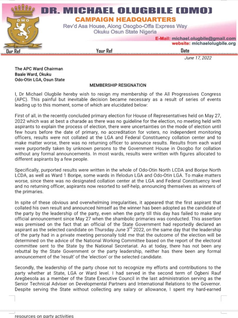 He said, “It’s with mixed feeling that I write to inform you that after many days and weeks of consultation with different stakeholders, last Sunday, I was at my ward meeting one more time to say thank you to party members for their support over the years before tendering my membership resignation letter from APC.