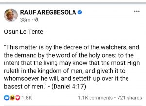 Reacting to the election results of the poll, hours after the official declaration of the winner, Aregbesola in his short article posted on his Facebook page on Sunday said “Osun Le Tente.”