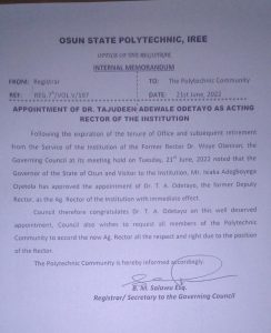 The Governing Council of the Instruction at its meeting of Tuesday 21st June, 2022 noted this through an official document signed by the Head of Service, Dr. Festus Olowogboyega Oyebade stated that “the Governor of the State of Osun, Mr. Adegboyega Oyetola has approved the appointment of Dr .T.A Odetayo as the Acting Rector of the Osun State Polytechnic Iree.