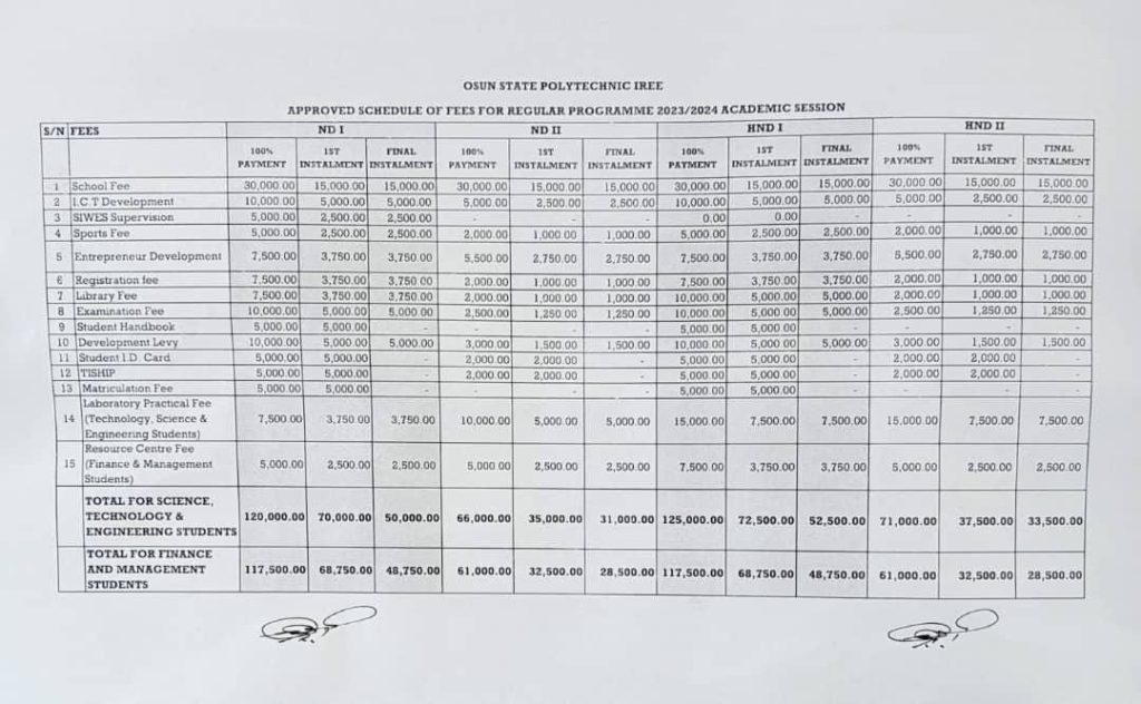 The authorities of the Osun State Polytechnic, Iree, have released reviewed school fees for the institution, AMILOADED reports.