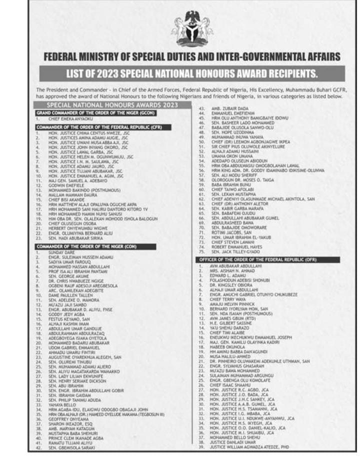 President Muhammadu Buhari has approved the award of National Honours to Nigerians and friends of Nigeria in various categories, AMILOADED reports.