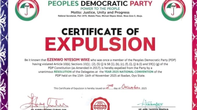 The National Working Committee of the Peoples Democratic Party has issued expulsion certificates to the Minister of the Federal Capital Territory, Nyesom Wike, and others expelled at the party’s last national convention in Ibadan, Oyo State.