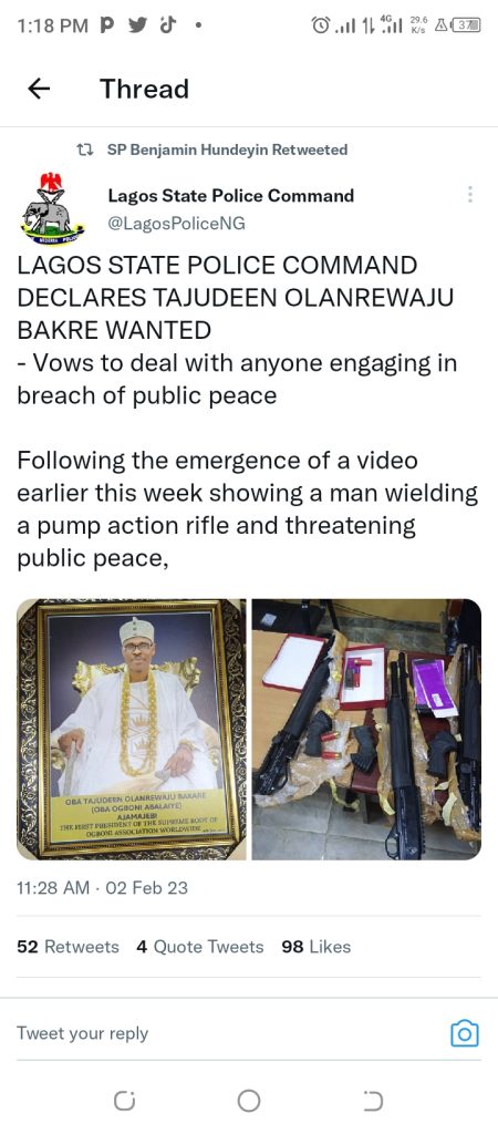 Hundeyin disclosed that the police acted on a video showing a man wielding a pump action rifle and threatening public peace.