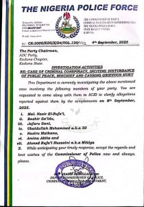 A police letter dated September 4, 2025, and signed by the Deputy Commissioner of Police in charge of the Criminal Investigation Department, CID, Uzainu Abdullahi, directed the ADC State Chairman to produce El-Rufai and the others at the State Criminal Investigation Department, SCID, on September 8.