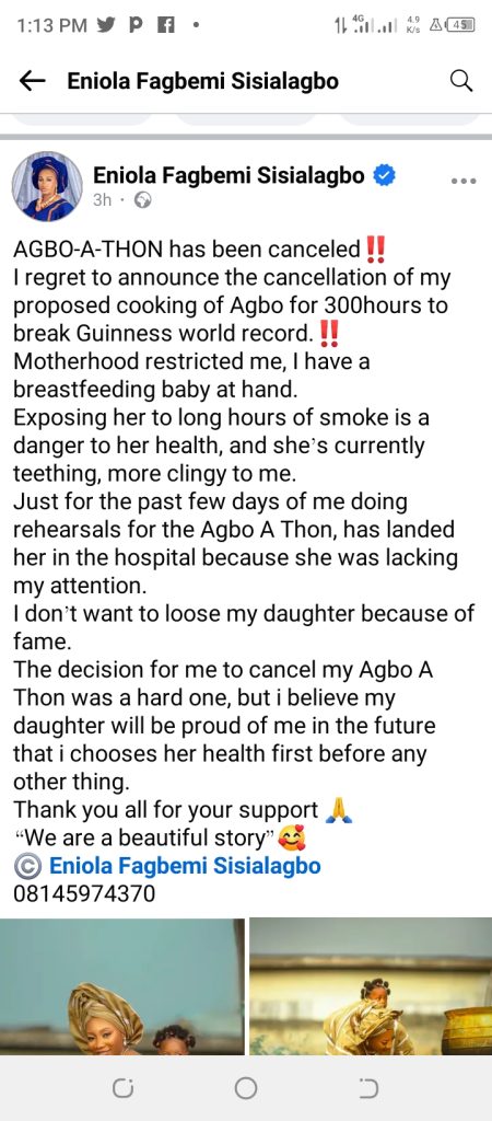 The post reads, “AGBO-A-THON has been canceled‼️I regret to announce the cancellation of my proposed cooking of Agbo for 300hours to break Guinness world record.‼️