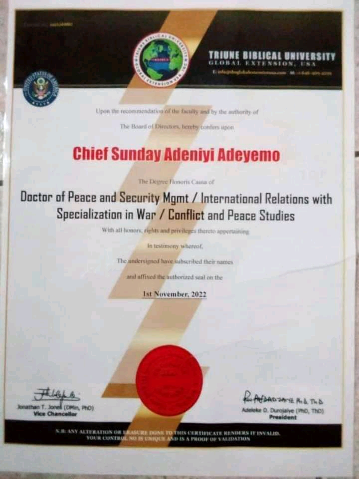 According to report, Triune Biblical University, USA award the doctorate degree to Igboho.