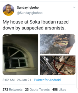 Confirming the report, Sunday Ighoho posted on his official twitter account with the caption “My house at Soka Ibadan razed down by suspected arsonists.”
