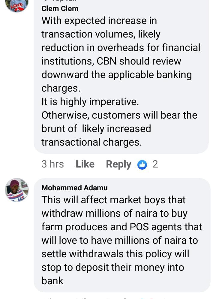 “1. The maximum cash withdrawal over the counter by individuals and corporate organisations per week shall henceforth be N100,000 and N500,000 respectively. Withdrawals above these limits shall attract processing fees of 5% and 10%, respectively.