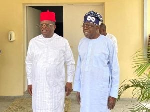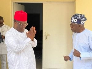 A chieftain of the All Progressives Congress and Presidential hopeful, Asiwaju Bola Tinubu, and the Governor of Ebonyi State, Dave Umahi, on Friday met in Abuja.