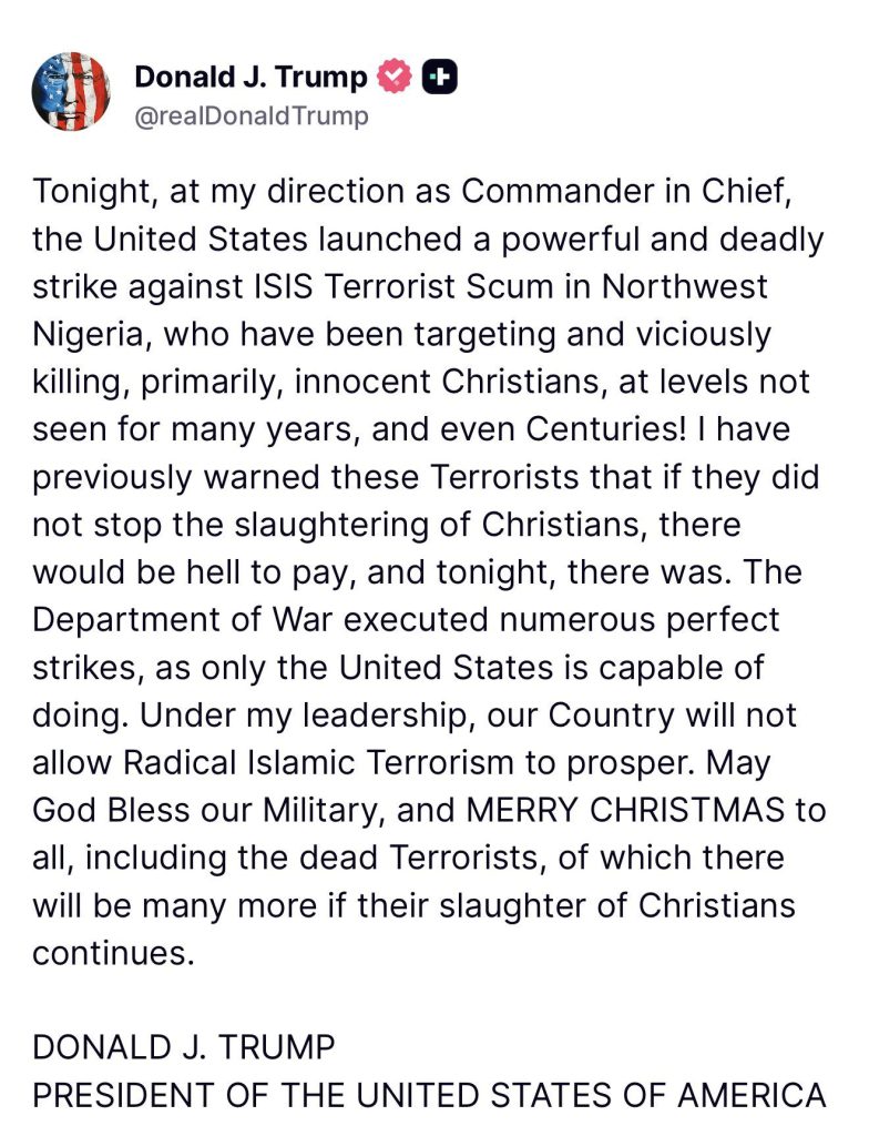 In a post on Truth Social, the US president described IS as ” terrorist scum”, accusing them of “targeting and viciously killing, primarily, innocent Christians”.