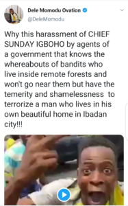 Also, Dele Momodu said: “Why this harassment of CHIEF SUNDAY IGBOHO by agents of a government that knows the whereabouts of bandits who live inside remote forests and won’t go near them but have the temerity and shamelessness to terrorize a man who lives in his own beautiful home in Ibadan city!!!”