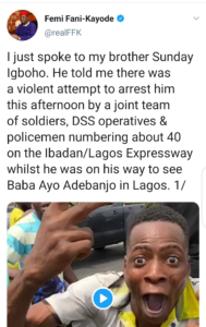 According to the former minister, he said:” I just spoke to my brother Sunday Igboho. He told me there was a violent attempt to arrest him this afternoon by a joint team of soldiers, DSS operatives & policemen numbering about 40 on the Ibadan/Lagos Expressway whilst he was on his way to see Baba Ayo Adebanjo in Lagos.