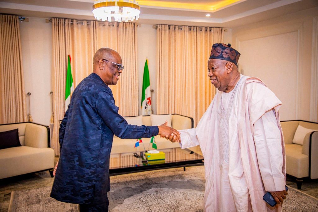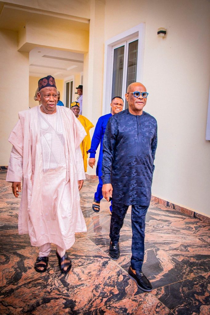 It stated, “Former governor of Rivers state and a minister-designate, HE. Nyesom Wike, paid a congratulatory visit to the national chairman, HE. Dr Abdullahi Umar Ganduje at his residence in Abuja.”