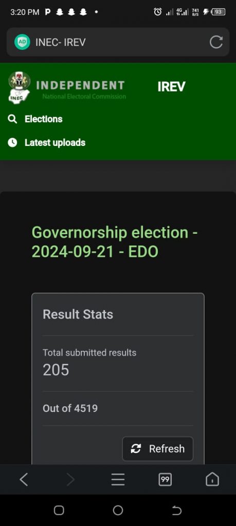 The Independent National Electoral Commission has uploaded 4.5 per cent of the results from the Edo governorship election onto its Result Viewing Portal.
