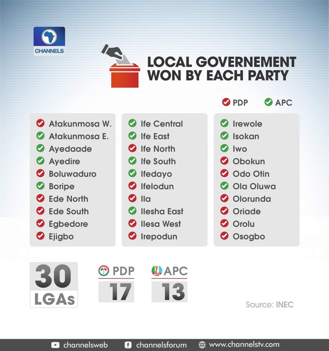 Incumbent Governor Adegboyega Oyetola of the All Progressives Congress (APC), however, won in the remaining 13 LGAs.