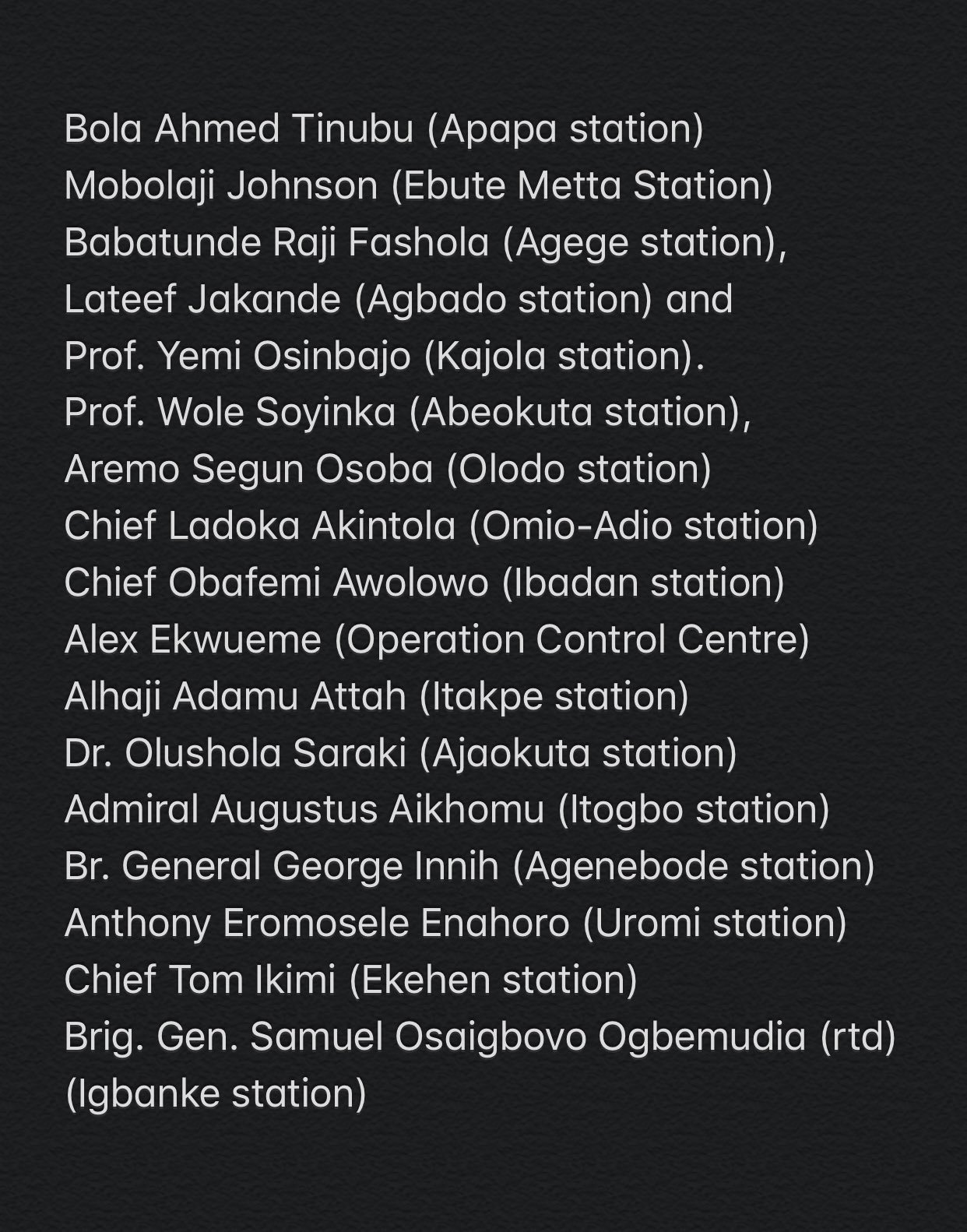 Others according to the statement include Goodluck Ebele Jonathan (Agbor Station Complex), Brigadier General David Ejoor (Abraka station), Micheal Ibru (Opara station), Alfred Rewane (Ujevwu station) and Vice Admiral Mike Akhigbe (Railway Village, Agbor).