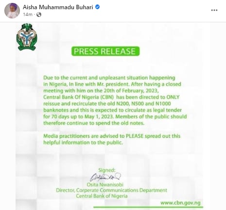 In the release shared on Aisha’s page on Tuesday, it was alleged that the old N500 and N1000 notes should remain legal tender till May 1, 2023.