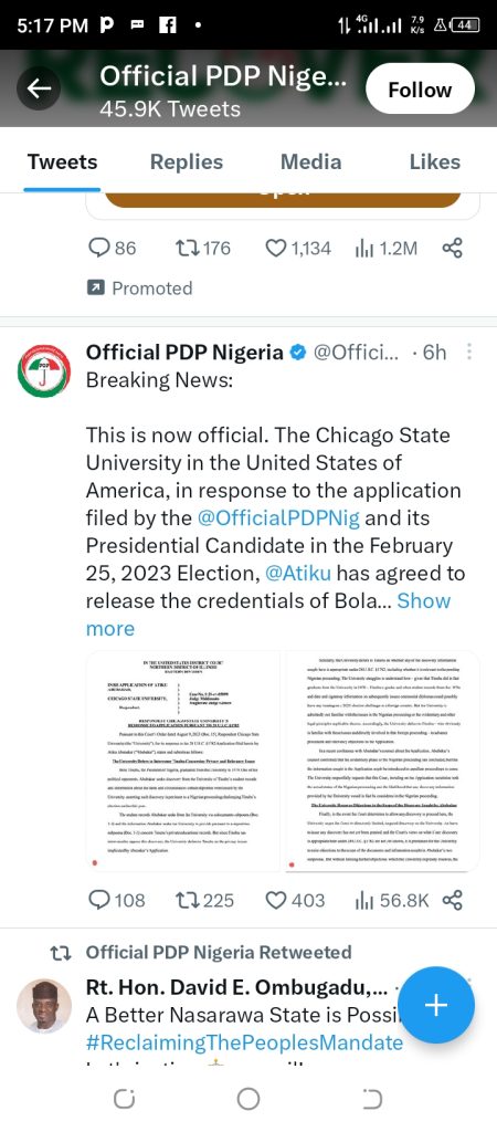 ”This is now official. The Chicago State University in the United States of America, in response to the application filed by the @OfficialPDPNig and its Presidential Candidate in the February 25, 2023 Election, @Atiku has agreed to release the credentials of Bola A. Tinubu.