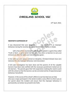 “We cannot as a school condone such. Consequently, is hereby placed on indefinite suspension until you as the parents ensure that she is punished, adequately counselled and rehabilitated.