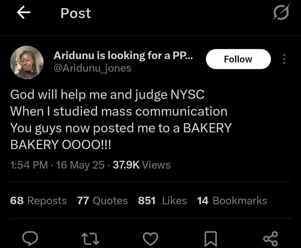 A Nigerian youth corps member who studied Mass Communication has taken to social media to express her frustration after being posted to a bakery for her NYSC.