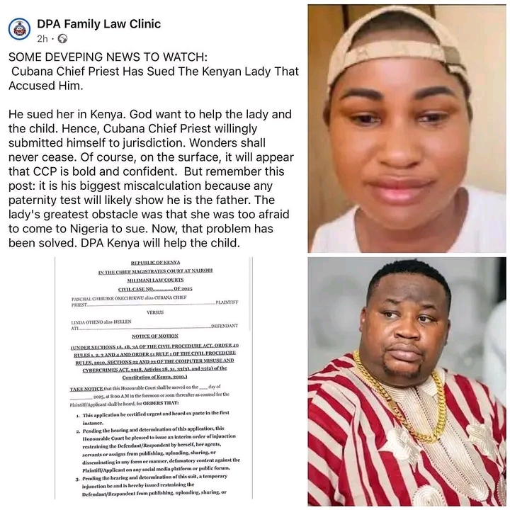 A Nigerian legal practitioner, Emeka Ugwuonye, has alleged that popular nightlife entrepreneur, Cubana ChiefPriest, has initiated legal action against a Kenyan woman, Hellen, who claims he fathered her child.