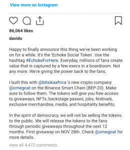 He wrote: “Happy to finally announce this thing we’ve been working on for a while. It’s the ‘Echoke Social Token’. Use the hashtag #EchokeForHere. Everyday, millions of fans create value that is captured by a few execs in a boardroom. Not any more. We’re giving the power back to the fans.