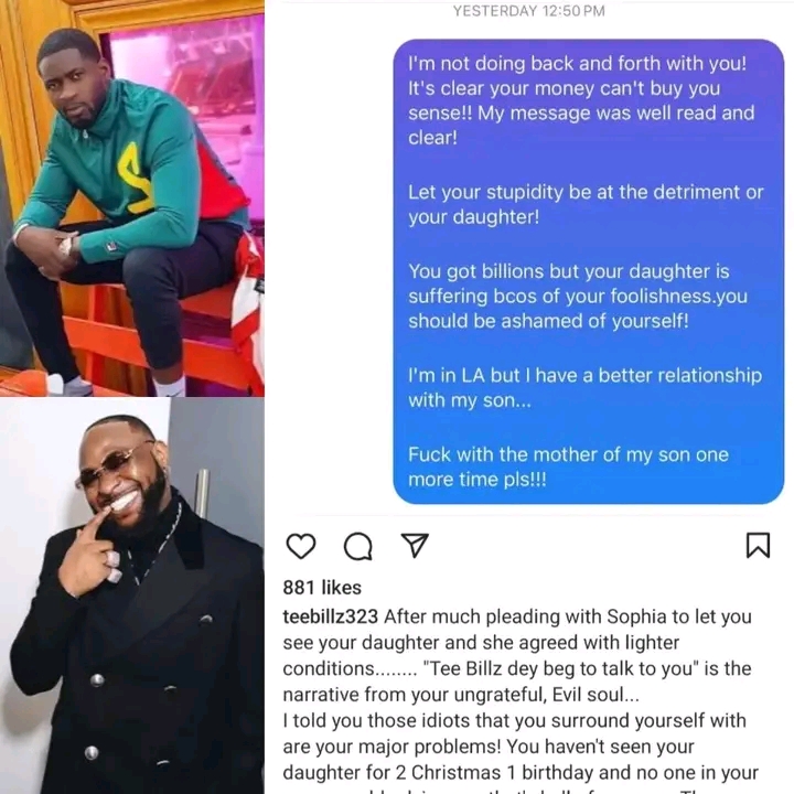 However, in a new post, Teebillz speaks on how Davido bullied the mother of his son Tiwa Savage 3 times by threatening to send boys to her.