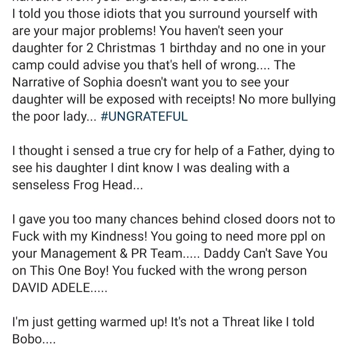 An excerpt from his post reads; “I told you those idiots that you surround yourself with are your major problems! You haven’t seen your daughter for 2 Christmas 1 birthday and no one in your camp could advise you that’s hell of wrong…. The Narrative of Sophia doesn’t want you to see your daughter will be exposed with receipts! No more bullying the poor lady… #UNGRATEFUL.”