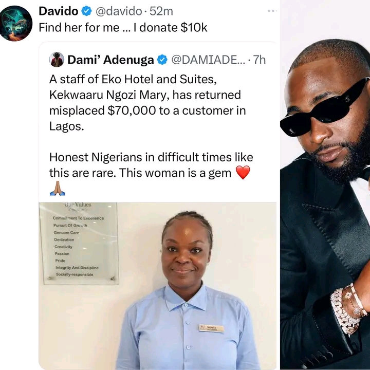 Popular Nigerian singer Davido has decided to reward the honesty and integrity of a dedicated staff member at Eko Hotel and Suites, Kekwaaru Ngozi Mary, with the sum of $10k (N8.6m) after she returned $70,000 to hotel management.