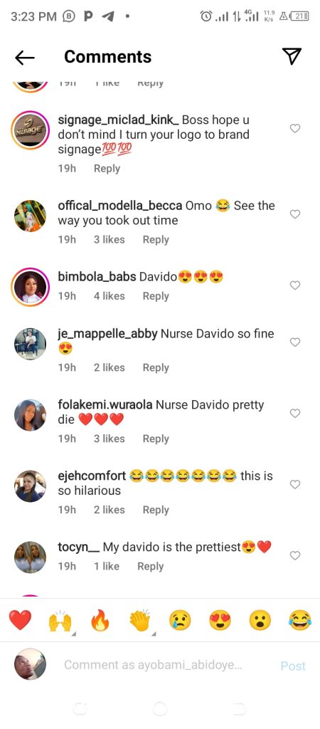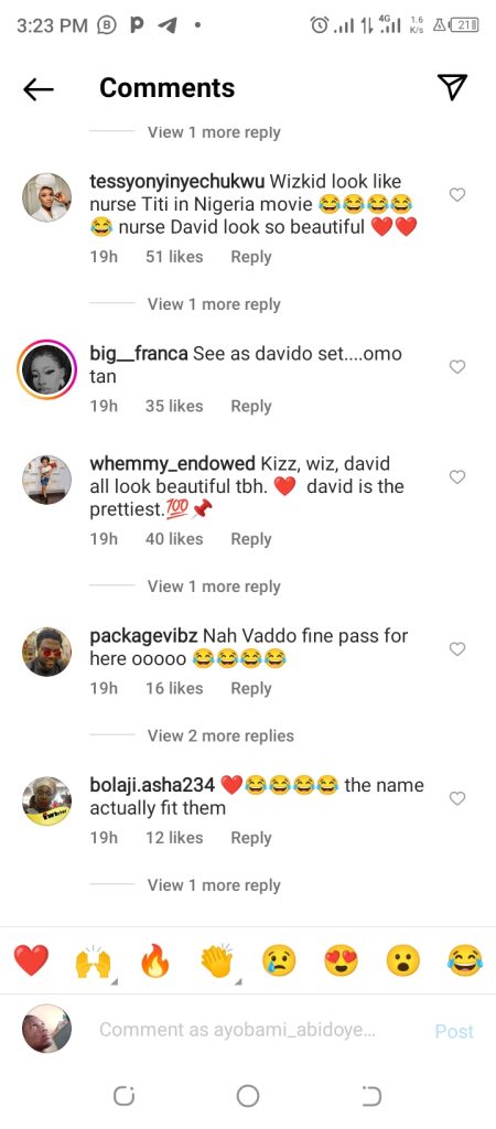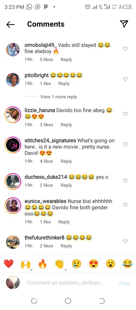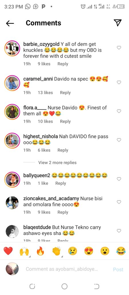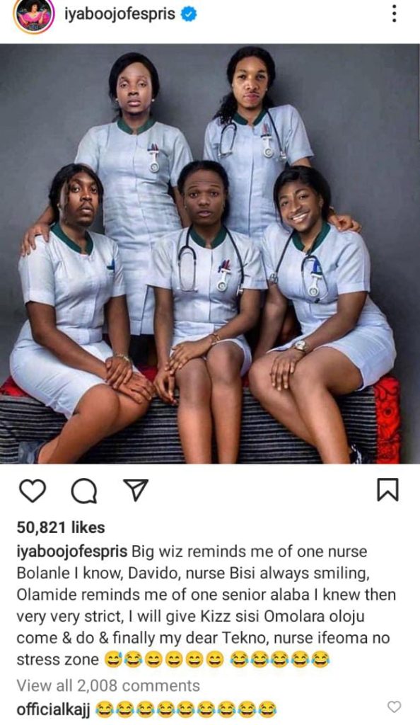 “Big wiz reminds me of one nurse Bolanle I know, Davido, nurse Bisi always smiling, Olamide reminds me of one senior alaba I knew then very very strict, I will give Kizz sisi Omolara oloju come & do & finally my dear Tekno, nurse ifeoma no stress zone 😅😂😄😄😄😄 😂😂😂😂😂”