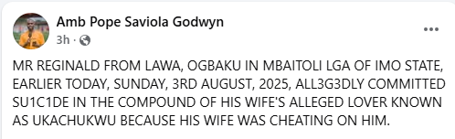 A man identified as Reginald from Lawa in Ogbaku, Mbaitoli Local Government Area of Imo State committed suicide over his wife’s alleged infidelity.