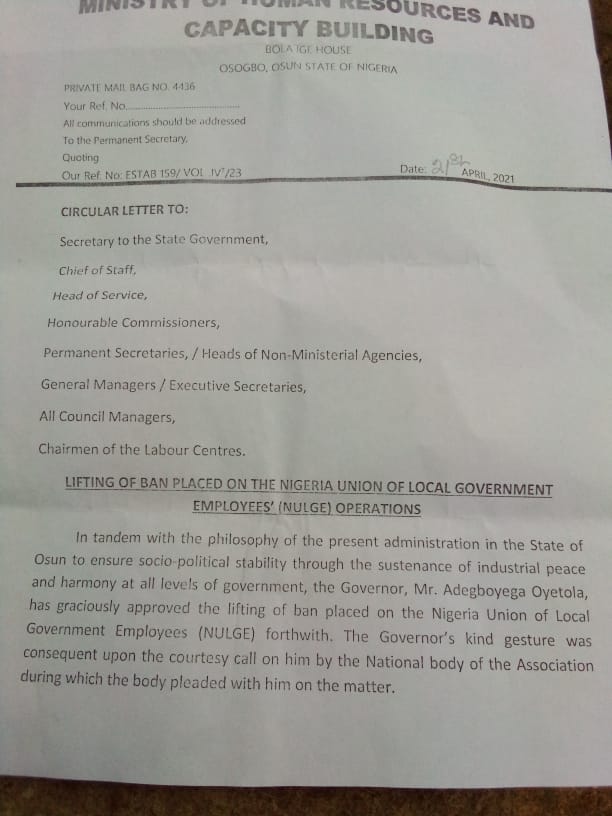 The circular read, “In tandem with the philosophy of the present administration in the State of Osun to ensure socio-political stability through the sustenance of industrial peace and harmony at all levels of government, the Governor, Mr. Adegboyega Oyetola, has graciously approved the lifting of ban placed on the Nigeria Union of Local Government Employees (NULGE) forthwith.