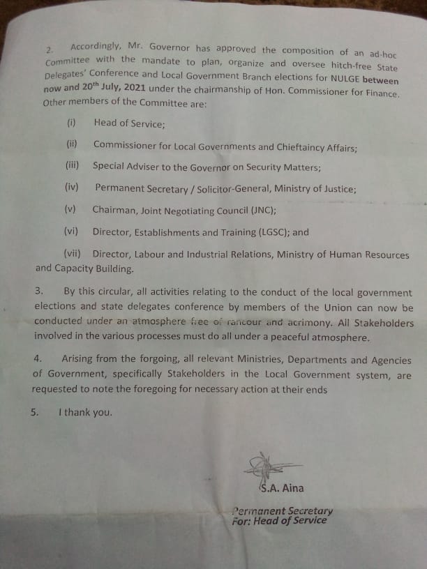 “Accordingly, Mr. Governor has approved the composition of an ad-hoc Committee with the mandate to plan, organize and oversee hitch-free State Delegates Conference and Local Government Branch elections for NULGE between now and 20th July, 2021 under the chairmanship of Hon. Commissioner for Finance.