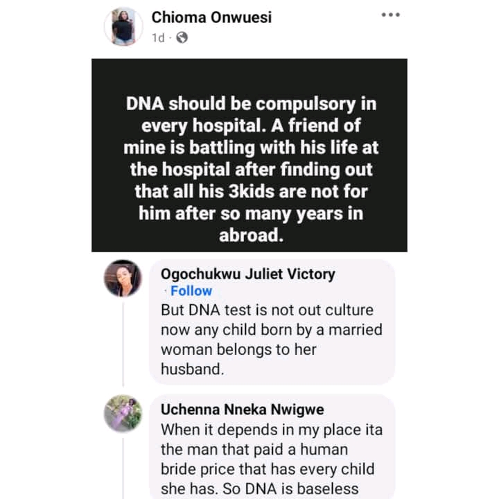 Another lady, Uchenna Nneka Nwigwe also said that in her village, all the children born by a woman belongs to the man that paid her bride price, adding that ‘DNA test is baseless’