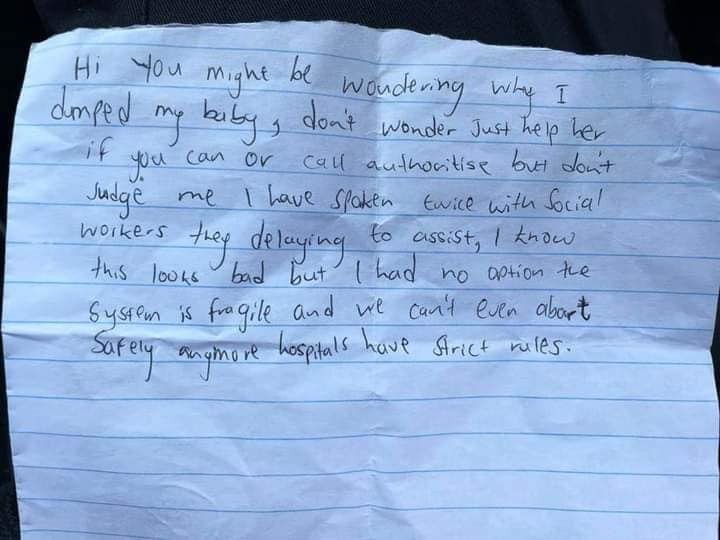 “Hi, you might be wondering why I dumped my baby, don’t wonder, just help her if you can or call authorities but don’t judge me. I have spoken twice with social workers. They are delaying to assist. I know this looks bad but I had no option. The system is fragile and we can’t even abort safely anymore. Hospitals have strict rules.” the note read.