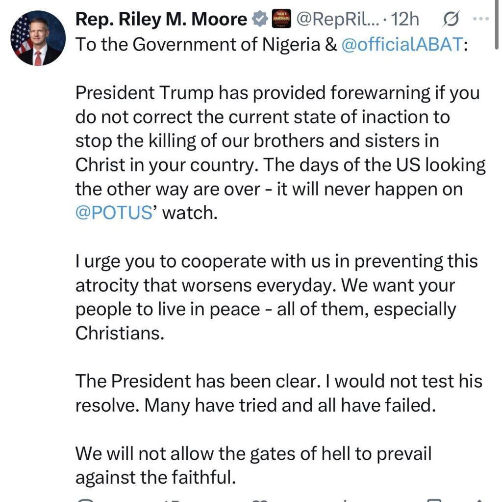 U.S. Representative Riley Moore has issued a stern warning to Nigerian President Bola Tinubu, urging immediate action to stop the killing of Christians in Nigeria and echoing President Donald Trump’s recent threat of military intervention.