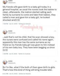 A Nigerian Twitter user has shared how his friend’s baby was mistakenly exchanged with another baby at a general hospital.